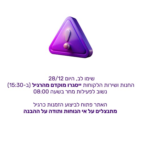 הזמנות שנקלטו במערכת עד השעה 12 בבוקר יטופלו באותו יום עסקים, כל הזמנה שנקלטה במערכת לאחר השעה 12 בבוקר תטופל ביום העסקים הבא.