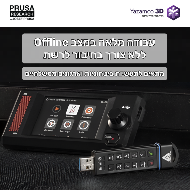 המדפסת CORE ONE L מאפשרת עבודה מלאה לחלוטין במצב Offline, ללא צורך בחיבור לרשת, אפילו לא בעת ההפעלה הראשונה.